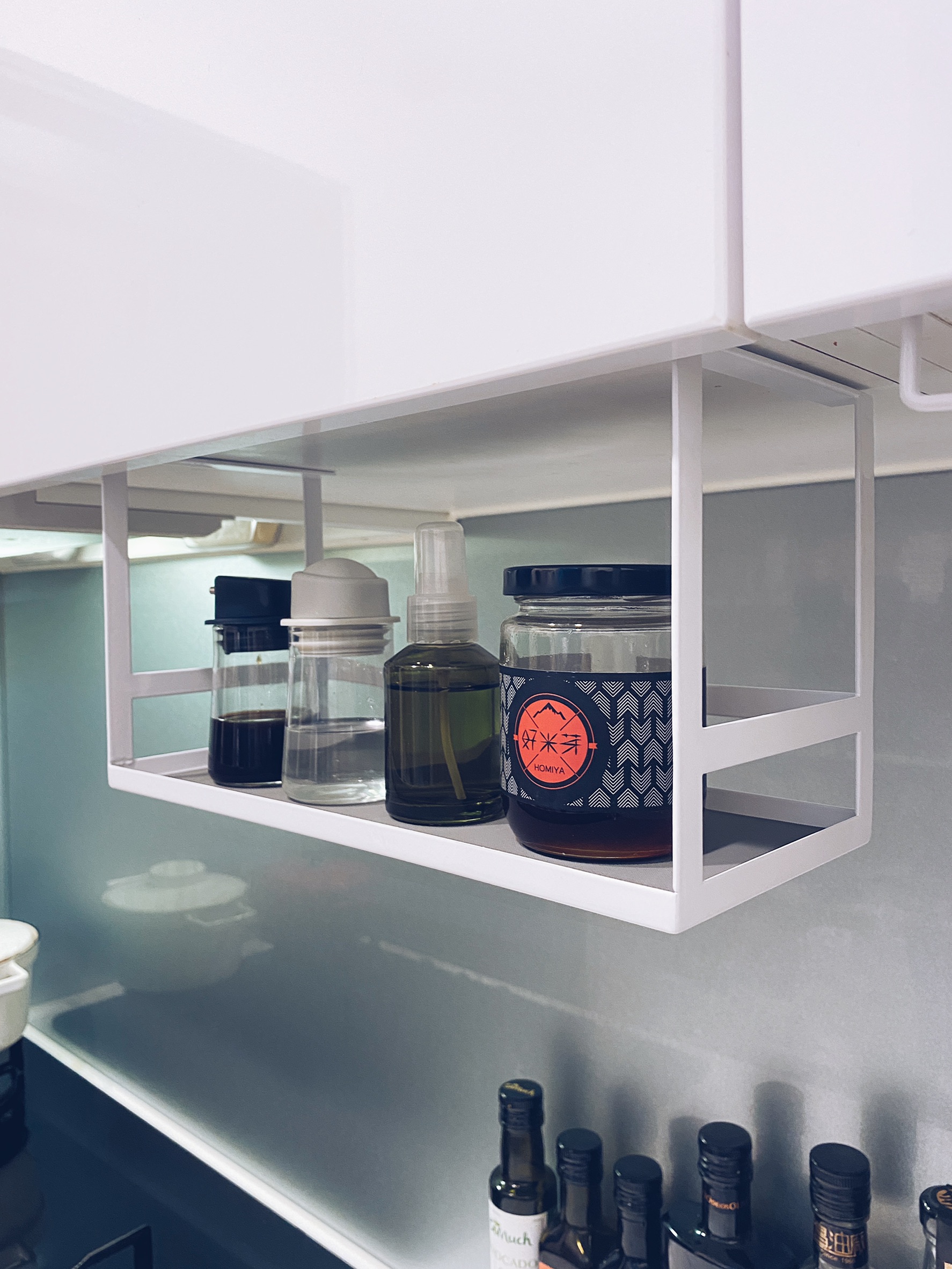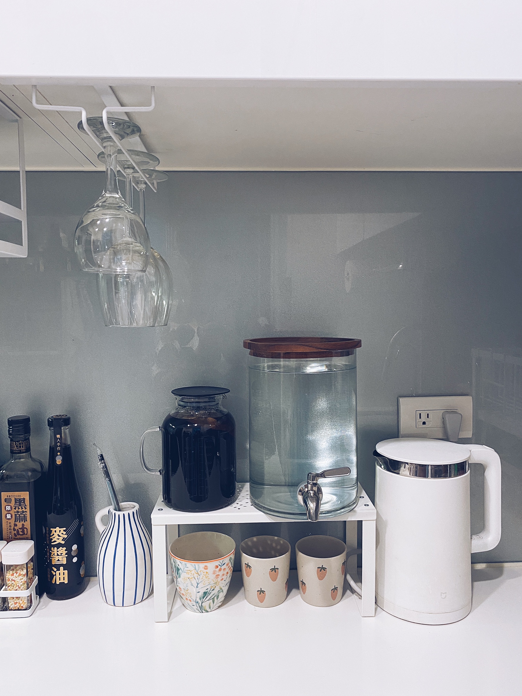 我選擇放在上層因為這樣底下還能收納茶包咖啡包