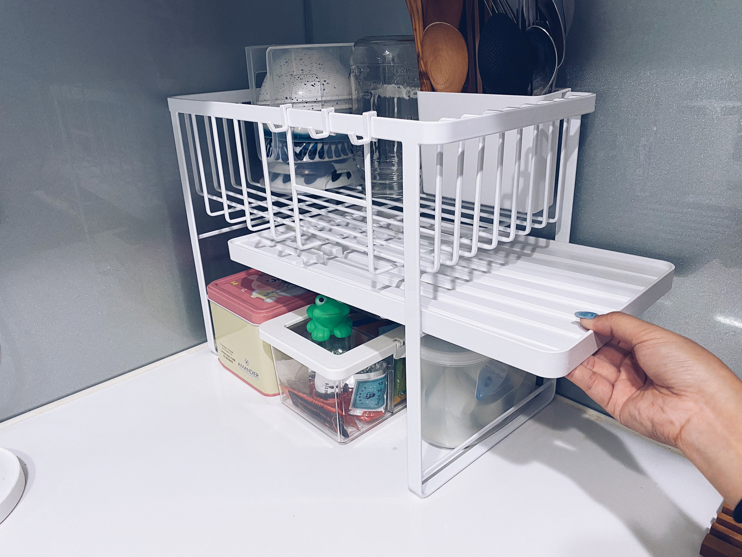 瀝水盤置放在上層使用示意,底下可以放一些收納盒,